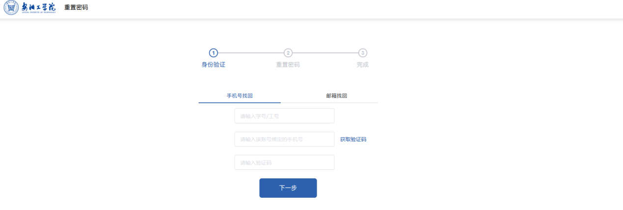 第一步:输入账号(教职工输入工号/学生输入学号),平台支持两种方式找回密码,手机号验证(激活账号绑定手机号时您填写的手机号)、邮箱验证(在个人中心绑定时您填写的邮箱)。