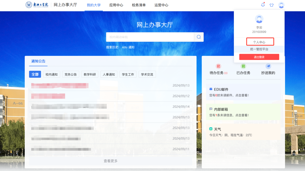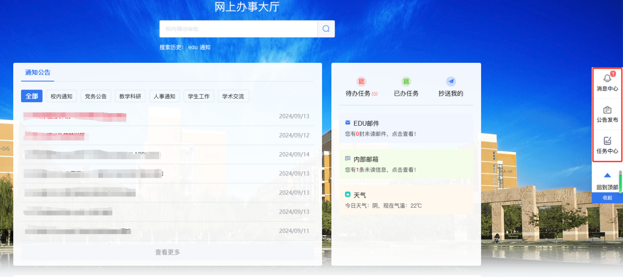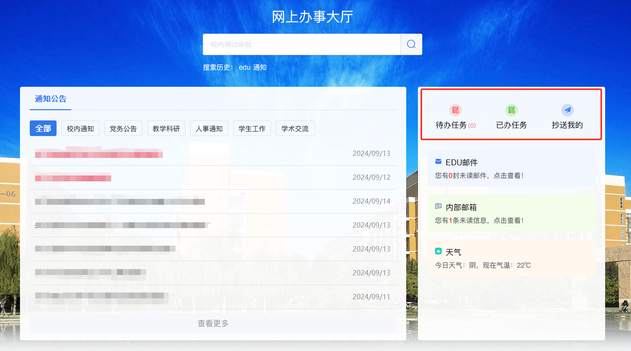 l任务中心:聚合所有流程服务类申请、审批任务的消息,教职工可以在任务中心针对需要处理的、已办理的、已申请的业务进行查看和处理。