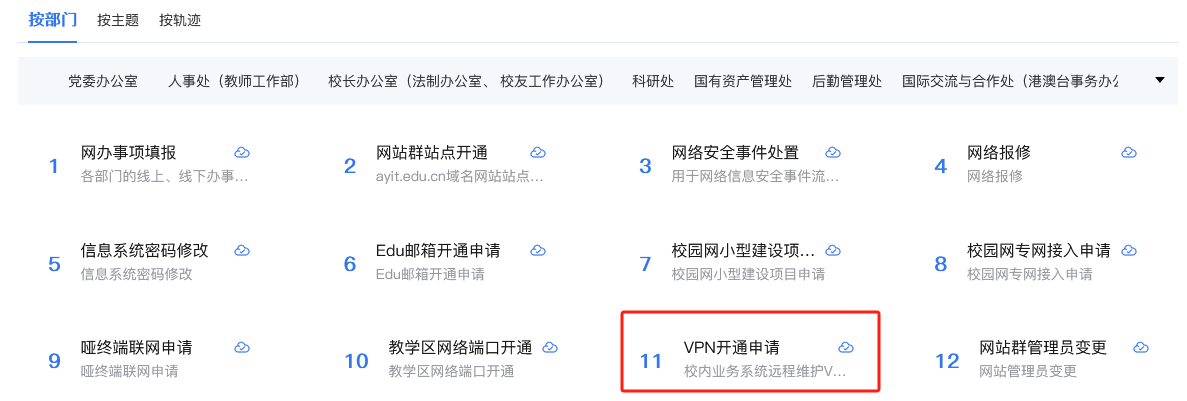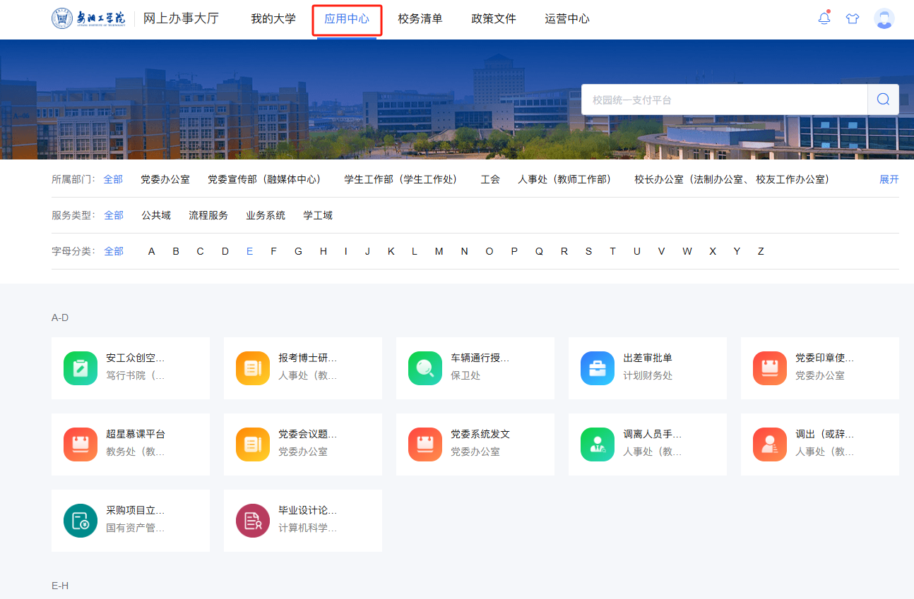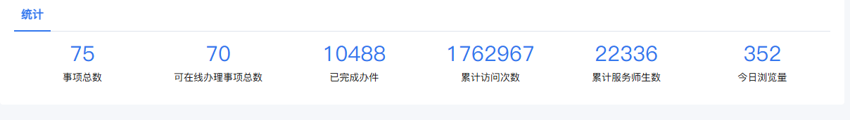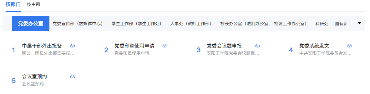 (9)事项查看:学校已上线所有事项,可按部门、按主题、按轨迹进行查看,同时教师只能查看教师相关的事项,学生只能查看学生相关的事项,所有事项在上线后已做了不同分类,便于师生更精准的进行查询。