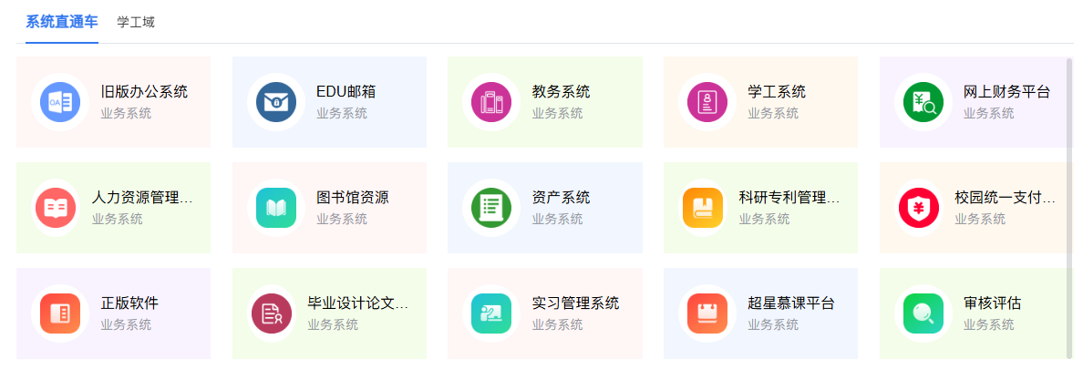 (5)系统直通车:实现了相关业务系统的单点登录功能,教职工直接点击对应系统名称图标,即可进入系统,无需再次输入密码,实现一个账号、一个密码,一次登录。