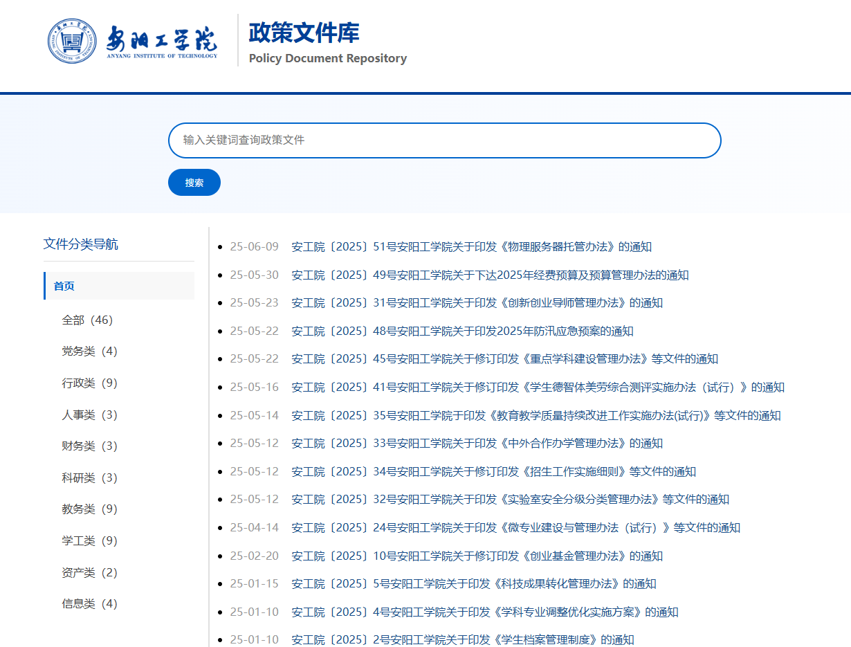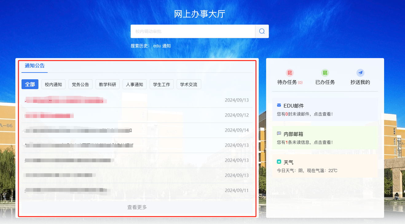 (1)通知公告:展示我校各部门通知公告,并根据各部门主办事务进行分类,以便用户快速了解、获取相关工作动态。