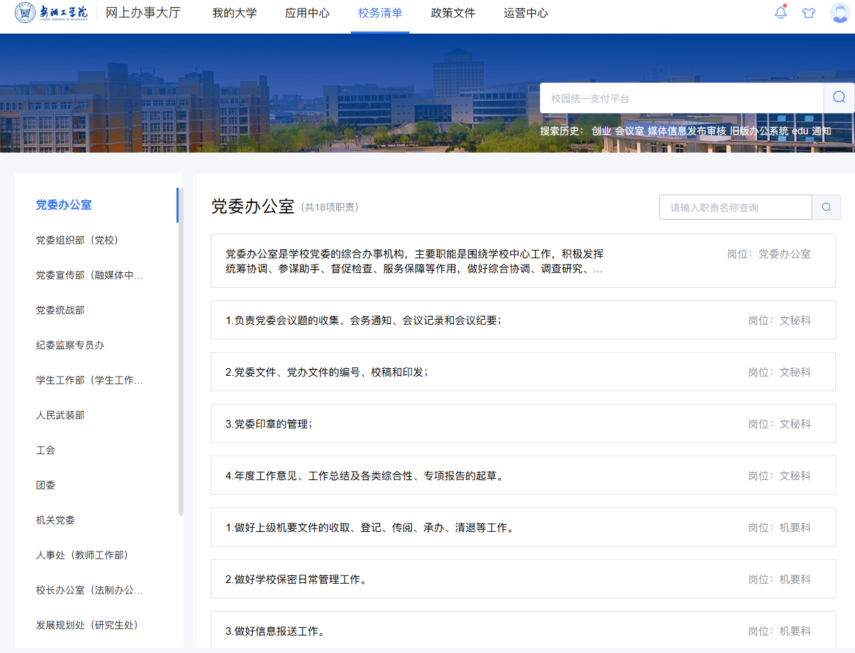 (14)校务清单:显示各部门岗位职责信息以及关联事项信息。